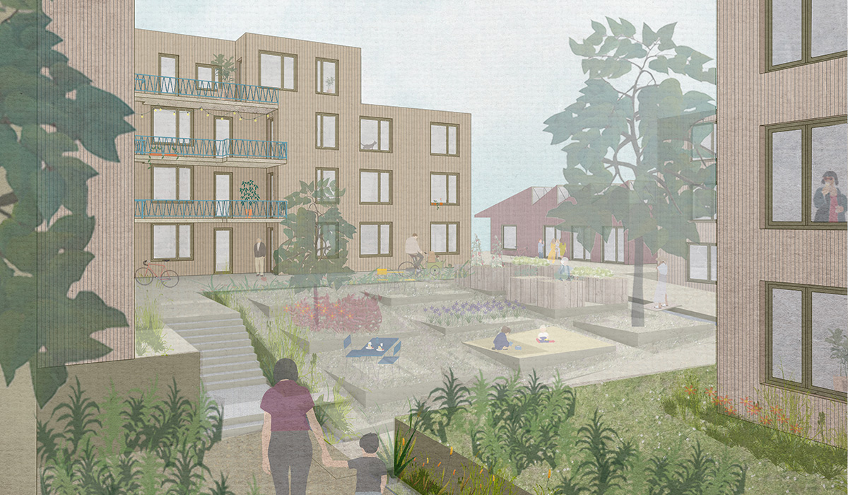 Im rückwärtigen Bereich entsteht ein gemeinschaftlich nutzbarer Gartenhof als grüne Oase. Holzspielpunkte, Trockenbiotope und ein überdachter Treffpunkt mit Feuerschale gliedern den Freiraum in wohnungsnahe Rückzugsräume. Ein begrünter Fahrradpavillon bietet Platz für Standard- und Sonderräder.